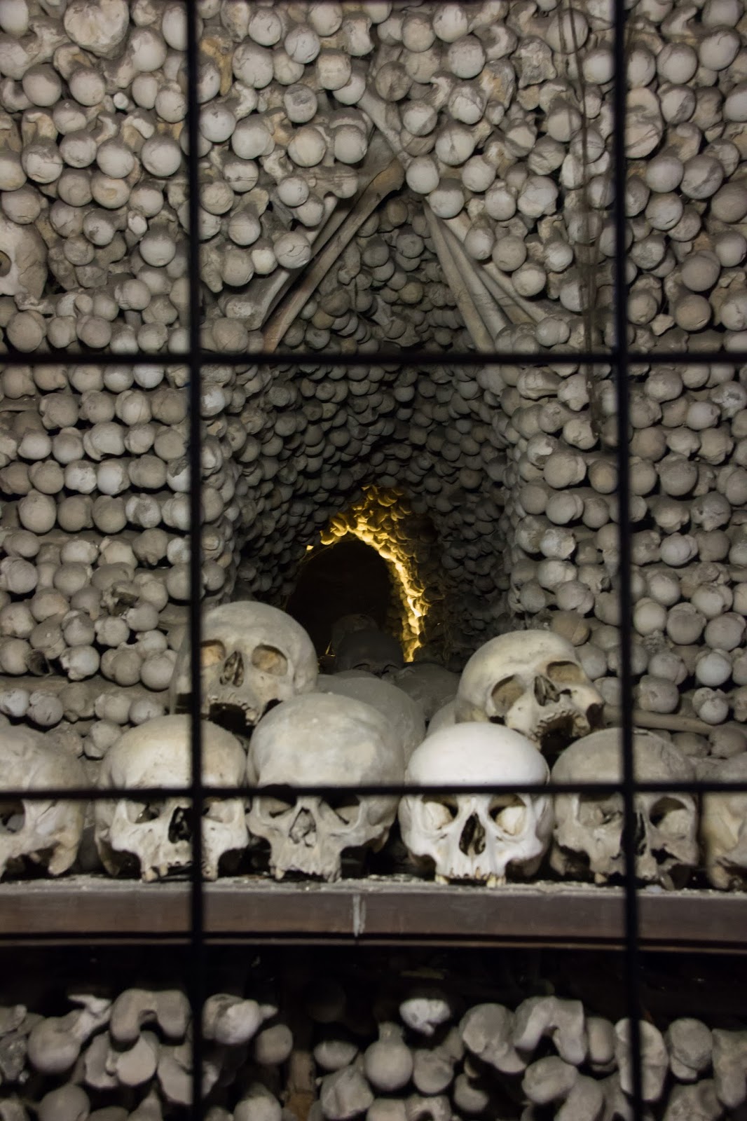 Now, Laurel & I had already seen something like this when we were in Paris and visited the Catacombs. Other than the fact that the Paris catacombs hold the bones of millions of people while the Bone Church holds only thousands, the main difference between the two is that the Bone Church is literally decorated with bones, in addition to housing piles of bones for storage purposes. These decorations were made by a woodcarver named Frantisek Rint. He was commissioned to decorate the chapel with the bones in 1870.